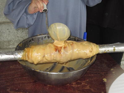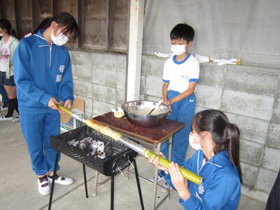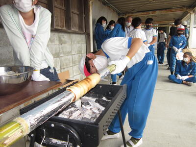 バームクーヘン作りの方法について説明を受けた後、早速作り始めました。始めはぎこちなく生地をかけた竹の棒を炭火の上で2人でまわしていましたが、時間がたつにつれてコツをつかみ、回し方も上手になってきました。