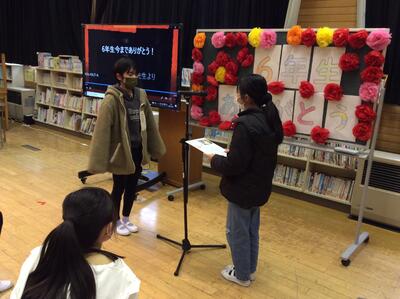 6年生を送る会 2022年3月3日 12時51分 6年生を送る会の様子です。1~5年生の動画による発表や6年生から在校生へのメッセージ、鼓笛の引き継ぎなどを行い、互いに感謝の気持ちを表すことができました。