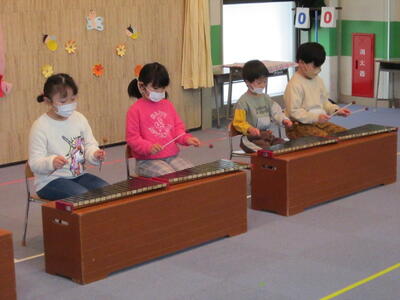 さくら組からは、合奏「さんぽ」のプレゼント。ちゅうりっぷ組からは合唱「にじ」、木琴演奏「こぎつね」のお返しがありました。