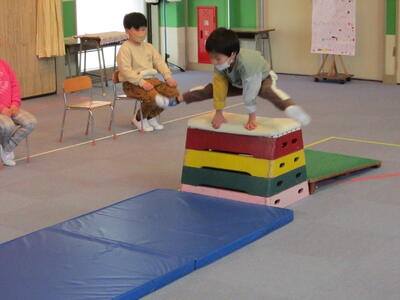 さらに、ちゅうりっぷ組のみんなは幼稚園でできるようになったことを発表しました。跳び箱や縄跳び、鉄棒など上手に披露することができました。